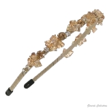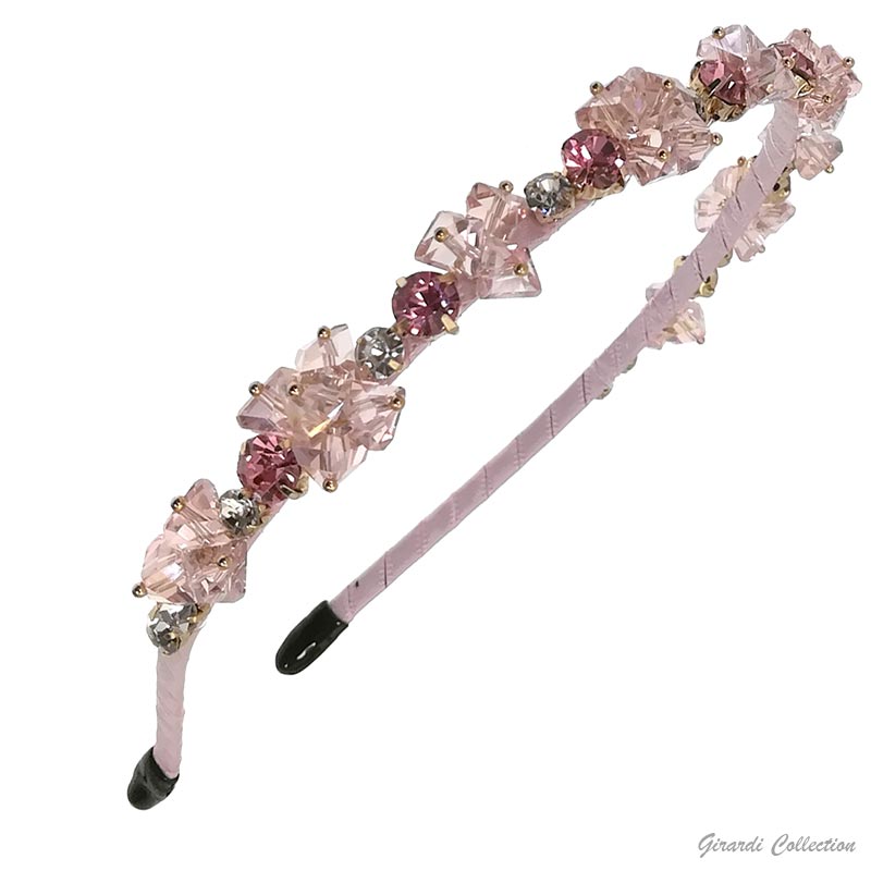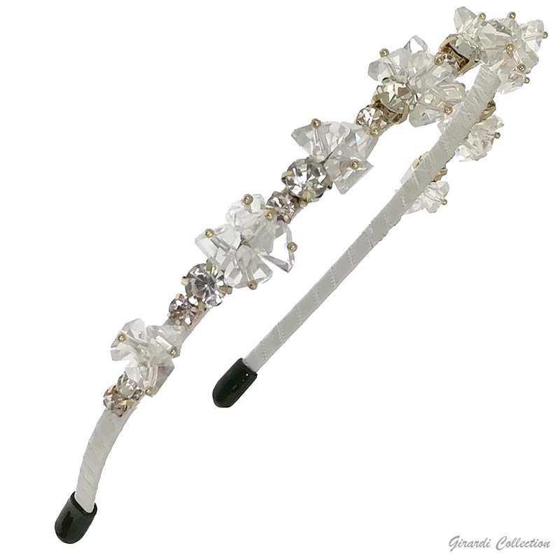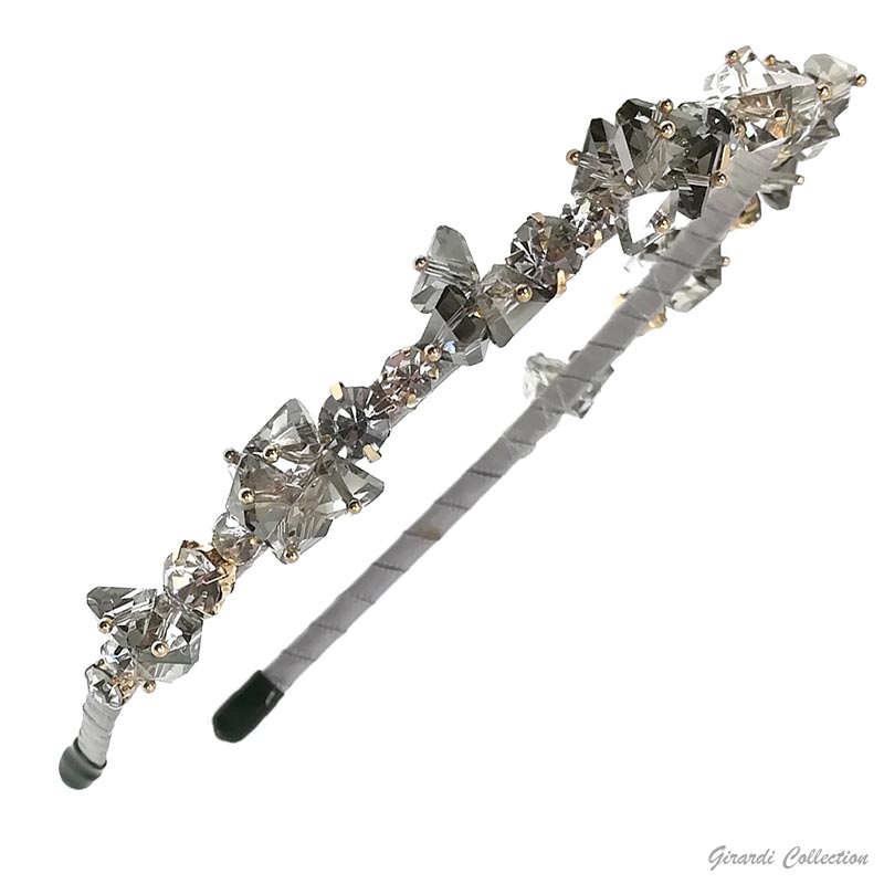 Cerchietto in metallo rivestito con nastro e gommini protettivi, con cristalli colorati e strass.