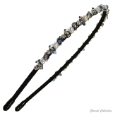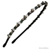 Cerchietto in metallo rivestito di nastro gros grain, decorato con perline, cristalli colorati e strass.